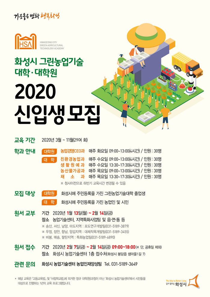 그린농업기술대학과 관련한 자세한 사항은 화성시농업기술센터 기술지원과 농업인재양성팀(031-5189-3649)로 문의하면 된다.