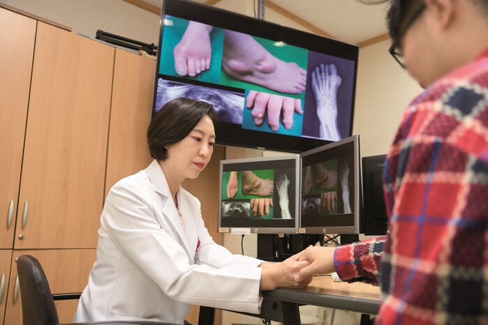 ▲강동경희대학교병원 관절류마티스내과 송란 교수가 한 남성환자를 진료하고 있다. |