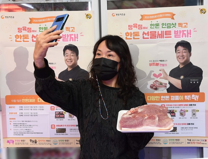 | ▲한돈자조금관리위원회가 진행하는 ‘2020 한돈데이 인증샷 이벤트’ 포스터 앞에서 한 소비자가 인증샷을 촬영하고 있다. 전국 1,001개의 정육점에서 참여할 수 있는 이 이벤트는 10월부터 11월 말까지 진행되며, 매달 3일 당첨자를 선정하여 두 달간 총 900명의 소비자에게 경품을 발송한다. |
