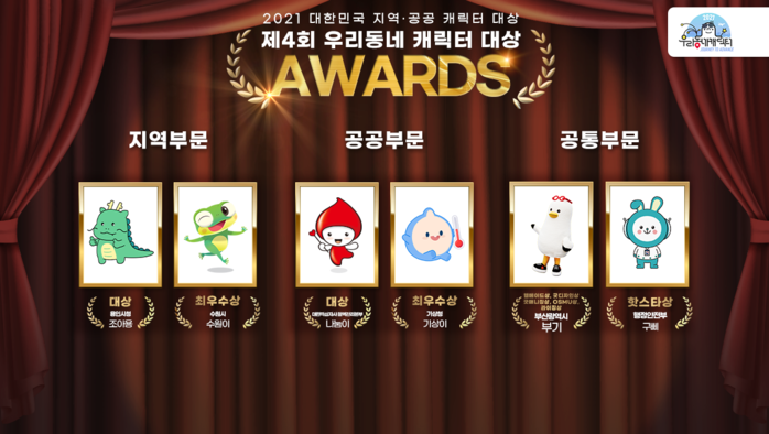 문화체육관광부(장관 황희)와 한국콘텐츠진흥원(원장 조현래, 이하 콘진원)은 지역 및 공공 캐릭터의 대국민 인지도를 높이고 지속적인 활용 독려를 위한 ‘제4회 우리동네 캐릭터 대상(2021 대한민국 지역·공공 캐릭터 대상)’ 시상식을 17일 온라인 개최했다.