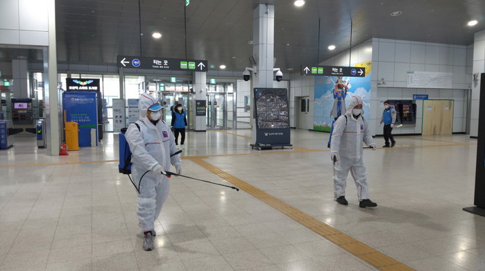 이날 지역자율방재단 20명은 많은 시민들이 오가는 전철역, 버스정류장, 공중화장실 등에 소독제 살포 등 방역활동을 진행했다.