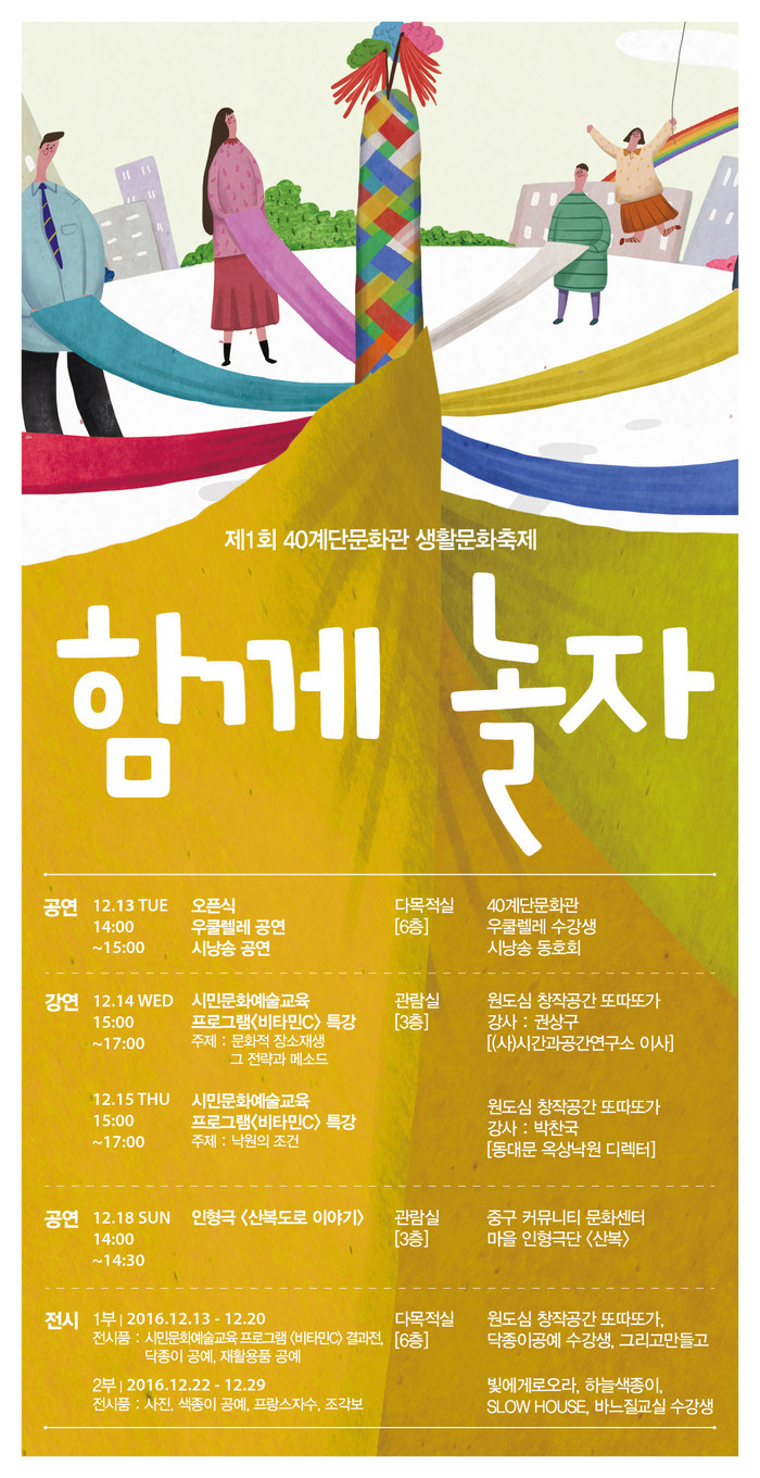 40계단문화관 생활문화축제는 올해 7월 20일 40계단문화관 생활문화센터를 개관하고 처음 열린다. 각자 따로 배웠지만 성과는 여럿과 나누자는 의미로 ‘함께 놀자’라는 주제로 진행된다.