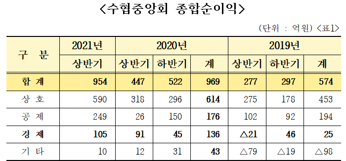 수협중앙회가 2021년 상반기 가결산 결과 잠정 세전종합순이익 954억원을 달성하며 전년동기대비 113% 증가한 실적을 달성했다. 상호, 공제, 경제사업 등 주요 사업부문에서 성과가 증가했다.
