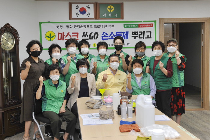 이날, 각동 새마을 부녀회 회장들로 구성된 남구 새마을 부녀회 봉사단 단원 13명은 ‘마스크 쓰GO 손소독제 뿌리GO!’ 라는 슬로건으로 손 소독제 500개를 직접 만들었다.