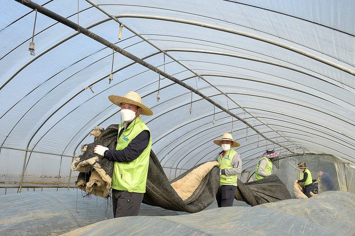 | ▲농협유통 임직원들이 27일 경기도 남양주 진건농협 관내 농가를 찾아 비닐하우스 만들기와 딸기 떡잎 제거를 하고 있다. |