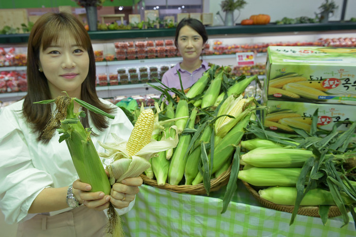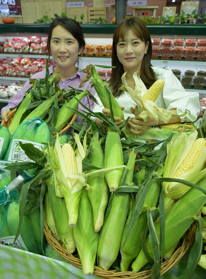 | ▲20일 서울 서초구 농협 하나로마트 양재점에서 모델들이 올해 첫 출하된 ‘찰옥수수’와 ‘초당옥수수’를 소개하고 있다. |