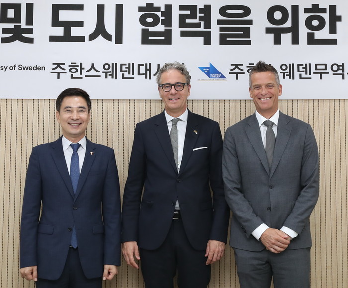 | ▲화성시-스웨덴 스마트시티 교류행사 기념촬영 모습. 왼쪽부터 서철모 화성시장, 야콥 할그렌 주한 스웨덴 대사, 호칸 셀벨 에릭슨엘지 대표.(화성시 제공) |
