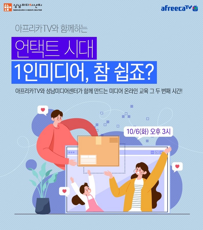 아프리카TV는 6일 오후 3시 성남미디어센터와 함께 1인 미디어 교육 프로그램 ‘언택트 시대, 1인 미디어 참 쉽죠’를 진행한다고 밝혔다. 이번 프로그램은 신종 코로나바이러스 감염증(코로나19)으로 인해 비대면 콘텐츠가 증가하는 상황에 맞춰 온라인으로 방송하는 법을 알려주기 위해 마련됐다.