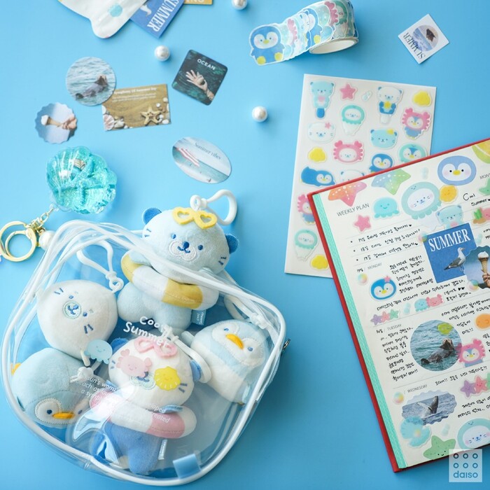 시리즈 무드를 귀엽게 담아낸 캐릭터 인형도 만나볼 수 있다. ‘손넣는 냉감 시팅인형’은 해달 캐릭터가 뭉툭한 팔다리로 불가사리나 조개를 들고 있는 모습을 앙증맞게 표현했다. 손을 넣을 수 있는 몸통 안쪽을 냉감 원단으로 구성해 아이와 함께 시원하게 인형극 놀이를 즐길 수도 있고, 소파나 침대에 패브릭용품과 함께 연출해 계절감을 더할 수도 있다. 아담한 사이즈의 ‘튜브 해달 걸이인형’은 빨간색 또는 노란색 튜브와 함께 색깔을 맞춘 하트모양 선글라스를 착용한 바캉스룩으로 구성했다. ‘2WAY 방수백’에 걸어 포인트를 주거나, ‘어항 모양 파우치’에 담아 헤엄치는 모습으로 연출해 인증샷을 찍어보는 것도 괜찮다.