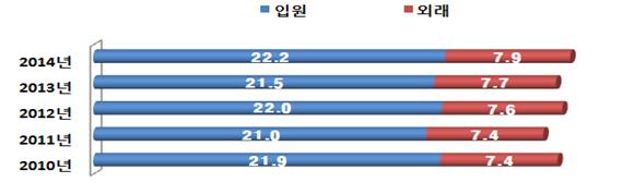 1인당 입원진료비는 2010년 109만원에서 2014년 131만 1000원으로 22만 1000원이 증가했고 1인당 입원일수는 2010년 21.9일에서 2014년 22.2일로 0.3일 늘었다.