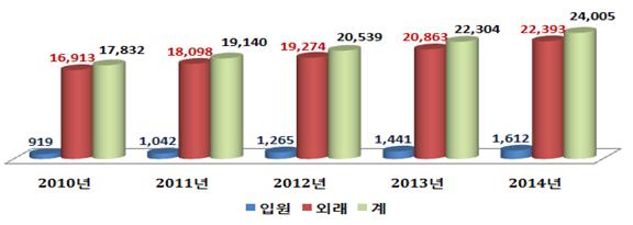1인당 외래진료비는 2010년 12만 7000원에서 2014년 16만 2000원으로 3만 5000원이 증가했으며 1인당 내원일수는 2010년 7.4일에서 2014년 7.9일로 0.5일 늘어났다.