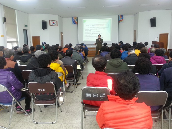 ▲12일 용담면 농민들이 우렁이농법을 교육받고 있다. |