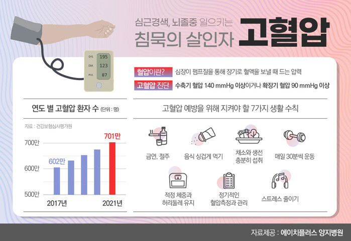 고혈압 환자가 고령화와 서구화된 식습관으로 해마다 증가하고 있다. 건강보험심사평가원 자료에 따르면 고혈압 환자는 2021년 701만명을 돌파했다. 4년전인 2017년 602만명에 비해 16.5%(100만명) 늘어난 것이다.