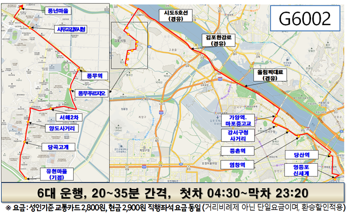 G6002번은 원도심인 풍무동 유현마을(사거리)에서 출발해 당곡고개, 양도사거리, 풍무역을 지나 시도5호선으로 가양역, 염창역, 당산역, 영등포역까지 운행하는 노선이며, G6004번은 학운산단의 금빛마을에서 출발해 신도시인 한강센트럴블루힐, 고려병원, 센트럴자이, 모담마을을 지나 DMC, 가좌역까지 운행하고 홍대입구, 합정역을 지나 돌아오는 노선이다.
