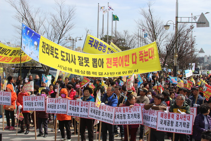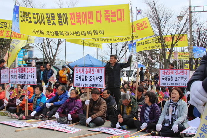 | ▲전북지역 어업인 500여 명이 지난 20일 전북도청 앞에서 서남해 해상풍력발전단지 조성을 반대하는 시위를 벌였다.(수협 제공) |