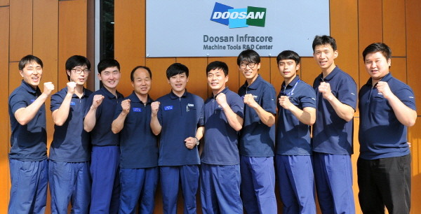 ▲ 올 하반기 국가기술자격시험을 통해 기능장 자격을 취득한 두산인프라코어 공작기계BG 기술직 사원들이 창원 남산공장 R&D센터 앞에서 기념촬영을 하고 있다 <사진제공=두산인프라코어>  |
