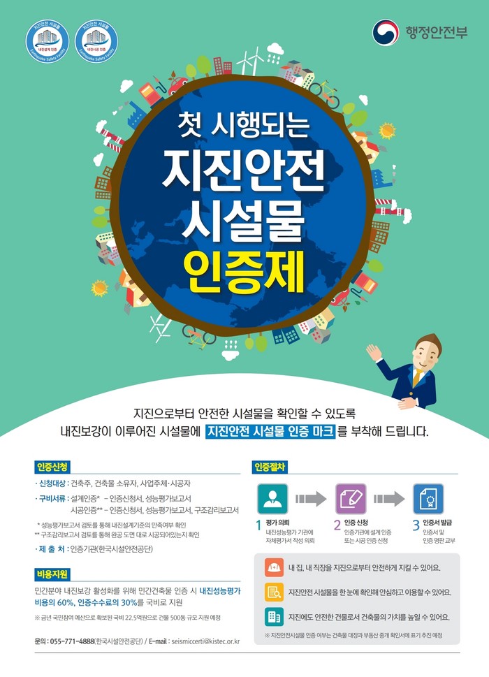 행정안전부가 올해 첫 도입한 ‘지진안전 시설물 인증제도’는 민간 건축물들이 자발적으로 내진성능을 높이고 안전성을 확보할 수 있도록 마련된 제도이다.