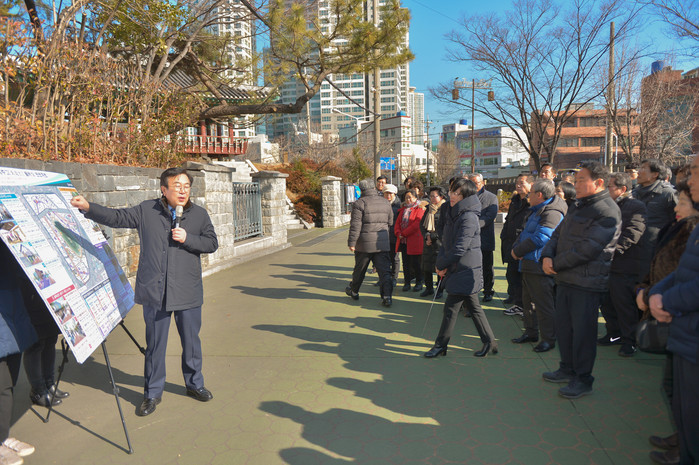 이날 서병수 부산시장은 지난해 도시재생뉴딜사업으로 선정된 범일2동 자성대공원 일원의 '레추고 플러싱' 사업에 대한 현장 설명회를 듣고 기억의 자산이 많은 동구가 도시재생뉴딜 사업 성공적 추진에 적극 협조해 줄 것을 요청했다.