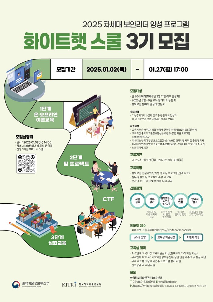 과학기술정보통신부가 주최하고, 한국정보기술연구원이 주관하는 ‘화이트햇 스쿨’은 정보보안 인재로 성장하길 희망하는 만 26세 이하 초급 인재를 대상으로 정보보안 입문 교육, 기술 멘토링 등을 제공해 중급 인재로 성장하도록 돕는 교육 프로그램이다.