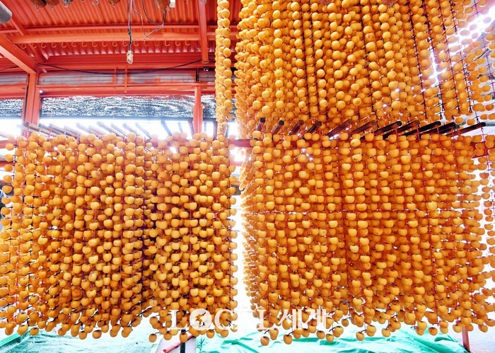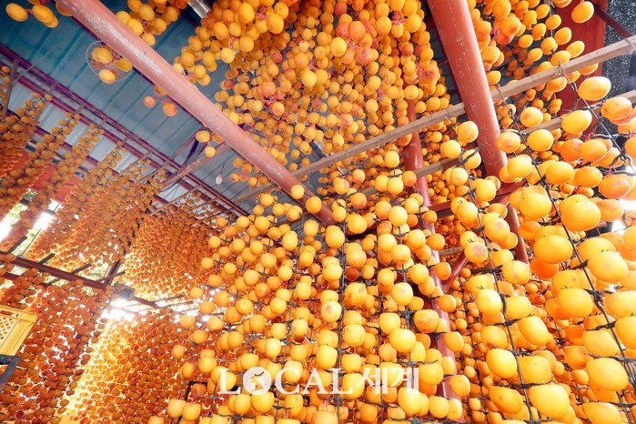 | ▲요즘 상주시 남장동 곶감마을에는 감을 깎고 말리는 곶감 만들기 작업이 한창이다. 주홍색의 감타래 물결이 장관을 이루고 있다. 곶감 종류는 청도 반시, 산청 고종시, 임실 먹시, 논산 월하시 등 전국에는 지역 특성에 따라 맛도 모양도 유래도 다른 여러 감 품종이 있는데 상주에는 곶감으로 만들면 맛있는 둥글둥글한 ‘상주둥시’로 유명하다. |