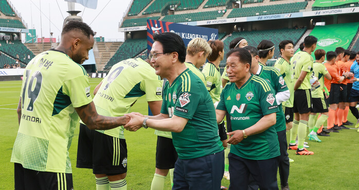 ▲전주월드컵경기장에서 펼쳐진 K리그 18라운드 경기 전북현대 선수단과 인사를 나누는 심덕섭 고창군수와 임정호 고창군 의장 사진/고창군 제공 |
