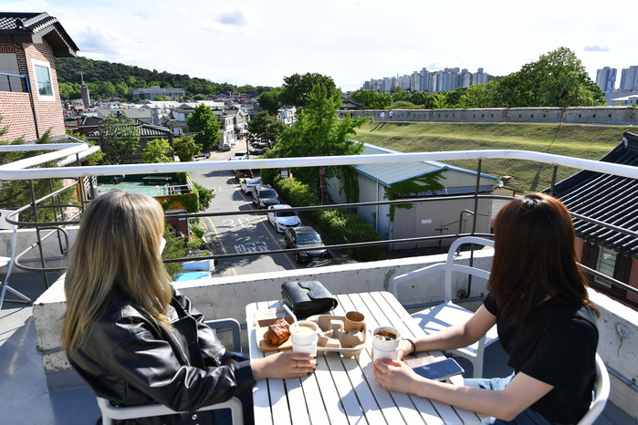 | ▲행궁동 카페를 찾은 관광객이 행궁동 골목 풍경을 보고 있다.(수원시 제공) |