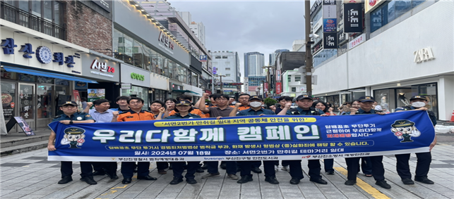 [로컬세계 부산=맹화찬 기자]부산진경찰서는 지난 18일 ‘서면2번가 일대’에서 부산진구청과 부산진소방서와 함께 범죄예방 및 지역공동체 안전을 위한 ‘우리 다 함께’ 캠페인을 추진했다고 밝혔다.