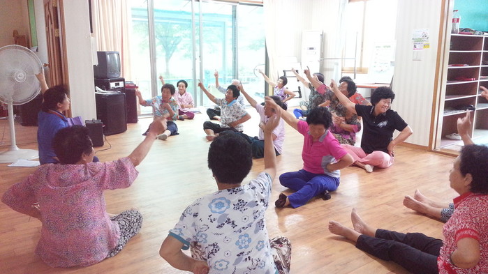 ▲어르신들이 진안군이 운영하는 사랑나눔방에서 몸을 풀고 있다. © 로컬세계 |
