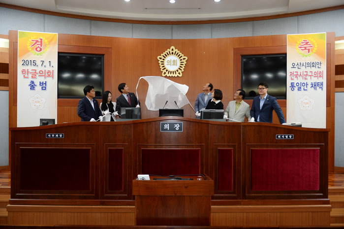 오산시의회의 한글의회 휘장 사용은 경기도 시·군의회 최초로 ‘오산시의회 의회기 및 의원배지에 관한 일부개정 규칙안’을 개정해 의회기, 의회배지, 의원신분증 중 한자‘議’를 한글 ‘의회’로 한자 ‘烏山市議會’를 한글 ‘오산시의회’로 변경하게 된데 따른 것이다.