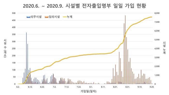 수원시가 관내 시설들의 일일 가입 현황을 파악해 본 결과, 전자출입명부 도입 초기인 6월 초에는 주로 의무시설들이 가입을 신청했다. 이후 8월 초 하루 10여 건 안팎으로 줄었던 전자출입명부 가입 시설 수는 지난 8월 18일 사회적 거리두기가 2단계로 강화되면서 급증하기 시작했다.