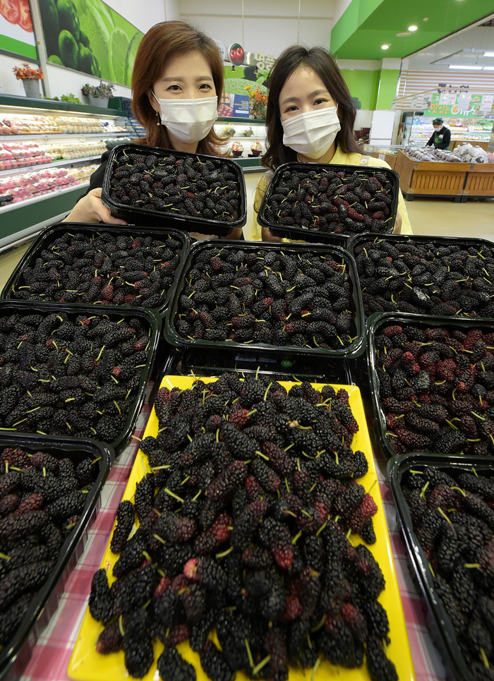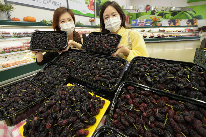 | ▲17일 서울 서초구 농협 하나로마트 양재점에서 모델들이 올해 첫 출하된 오디를 선보이고 있다. 농협유통 제공 |