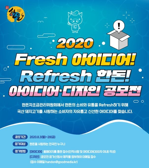 한돈자조금관리위원회(이하 한돈자조금)가 신선한 한돈 유통을 위한 아이디어 및 패키지 개발을 위해 이달 28일까지 ‘2020 한돈팩 아이디어·패키지 공모전’을 운영한다고 밝혔다.