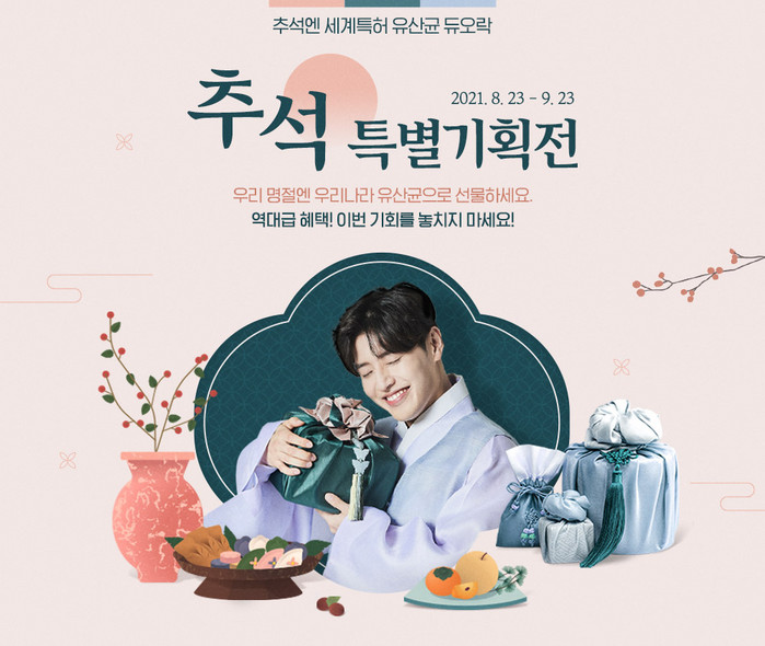마이크로바이옴 전문기업 쎌바이오텍이 ‘우리나라 명절엔 우리나라 유산균, 듀오락’을 컨셉으로 ‘추석 특별기획전’을 실시한다. 이번 기획전은 사회적 거리 두기로 인한 비대면 선물 수요가 급증할 것으로 예상돼 예년보다 이른 8월 23일부터 9월 23일까지 한 달간 듀오락 몰 홈페이지에서 진행된다.