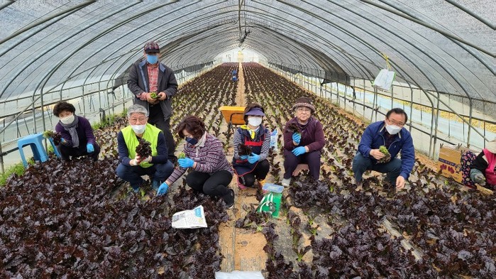 | ▲농협중앙회 서울지역본부 이대엽 본부장(앞줄 왼쪽 첫 번째)을 비롯한 임직원과 서울 경서농협(조합장 이철환), 서울 고향주부 모임(회장 안영희) 회원들이 지난 10일 경기 부천시 오정구 고강동 소재 농가에서 상추 수확 작업을 하고 있다.(서울농협 제공) |