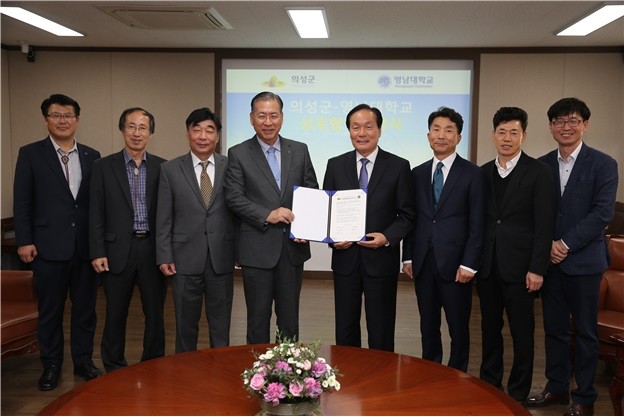 | ▲김주수 의성군수(오른쪽에서 4번째) 지난 24일 영남대학교를 방문해 지역의 상생발전 및 상호 협력·발전을 위한 업무협약을 체결했다.(의성군 제공) |