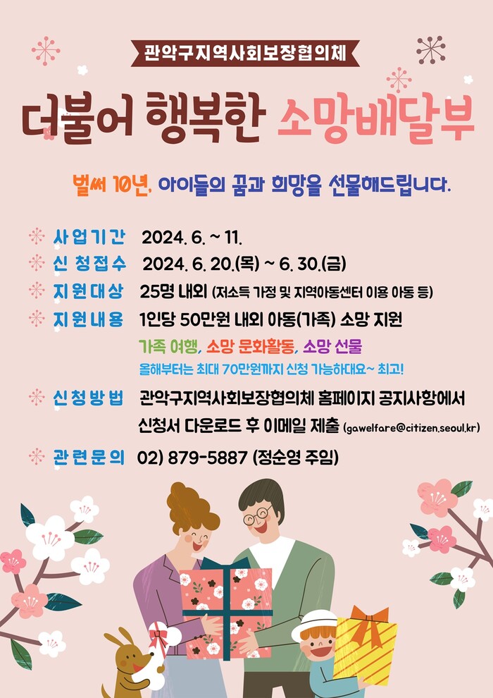 ‘더불어 행복한 소망배달부’는 취약계층 아이들이 평소에 꿈꾸던 소원을 이뤄주는 사업으로, 그동안 구는 2015년부터 9년 간 256명 아이들의 소원을 들어주었다.