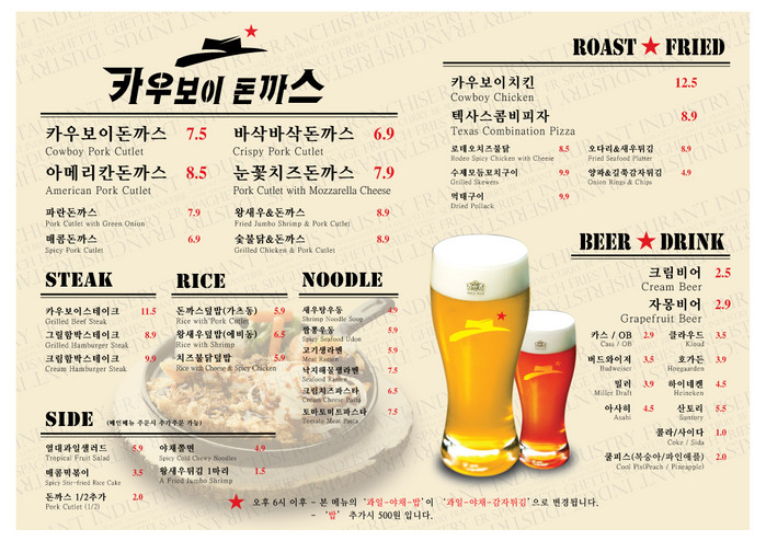 | ▲카우보이돈까스 메뉴판. 식사와 맥주를 즐길 수 있는 게스트로펍 콘셉트를 지니고 있다. |