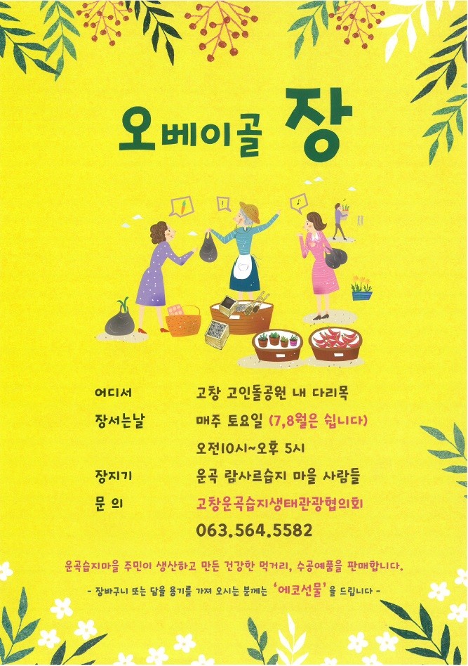 고인돌공원 내 다리목(고창읍 매산 마을 경로당 일대) 주변에서 진행하는 ‘오베이골 토요장터’는 매주 토요일 10시부터 오후 5시까지 정기적으로 운영한다고 밝혔다.