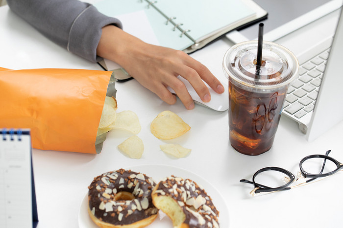 과자, 초콜릿류는 그 자체로 칼로리가 당분이 많지만 특히 업무를 보면서 먹을 땐 무의적으로 계속 손이 가 평소보다 더 많은 양을 섭취할 수 있다.