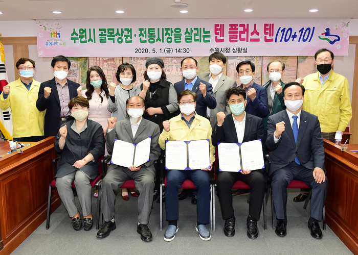 수원시와 수원시소상공인연합회, 수원시상인연합회는 지난 1일 시청 상황실에서 ‘수원시 골목상권·전통시장을 살리는 10+10 업무협약’을 체결하고, 코로나19 사태로 위축된 소비를 촉진하기 위해 적극적으로 협력하기로 했다.