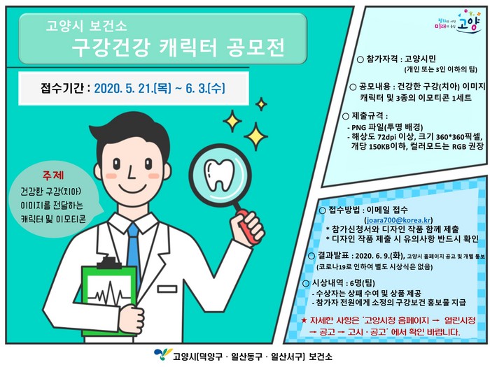 [로컬세계 최아침 기자]경기 고양시는 오는 6월 9일 구강보건의 날을 맞이해 ‘고양시 보건소 구강건강 캐릭터’를 공모한다고 21일 밝혔다.