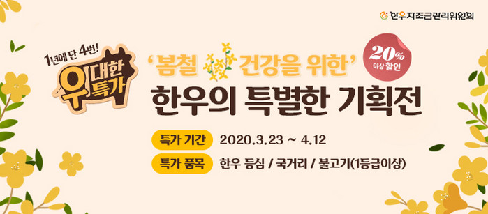 민경천 한우자조금 위원장은 "코로나19로 사회적 거리 두기에 동참하는 소비자들이 우리 한우를저렴한 가격에 구입해 가정에서 즐길 수 있도록 이번 특가전을 마련했다”며 “우리 한우와 함께 건강하고 활기찬 봄날을 보내시길 바란다”고 전했다.