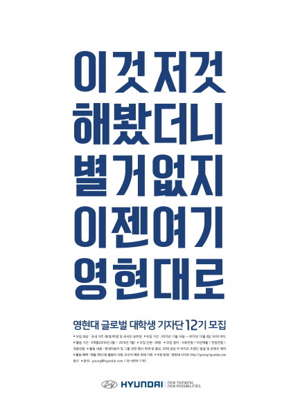 이번 기자단은 국내 거주 중인 내국인 재·휴학생과 외국인 유학생이라면 누구나 현대자동차 대표 대학생 사이트 영현대를 통해 지원이 가능하다.