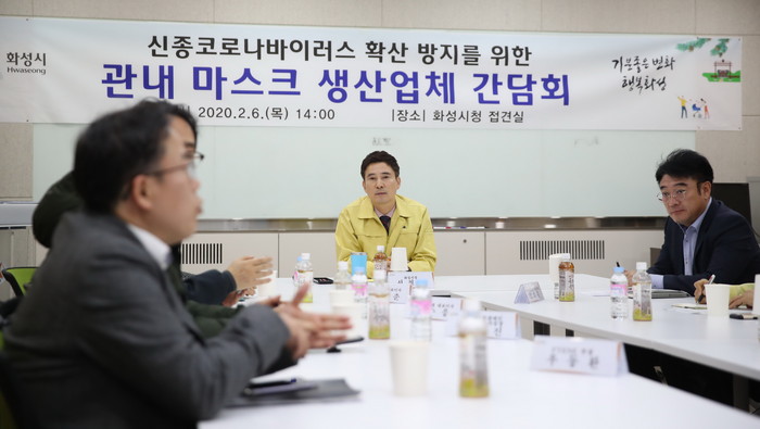 [로컬세계 고용주 기자]서철모 화성시장은 지난 6일 시청 소회의실에서 코로나 감염증 확진자 추가 발생으로 마스크 매점매석 논란이 일고 있는 가운데, 관내 마스크 생산 업체와 간담회를 갖고, 생산 현황 등을 점검하고 애로사항을 청취했다.