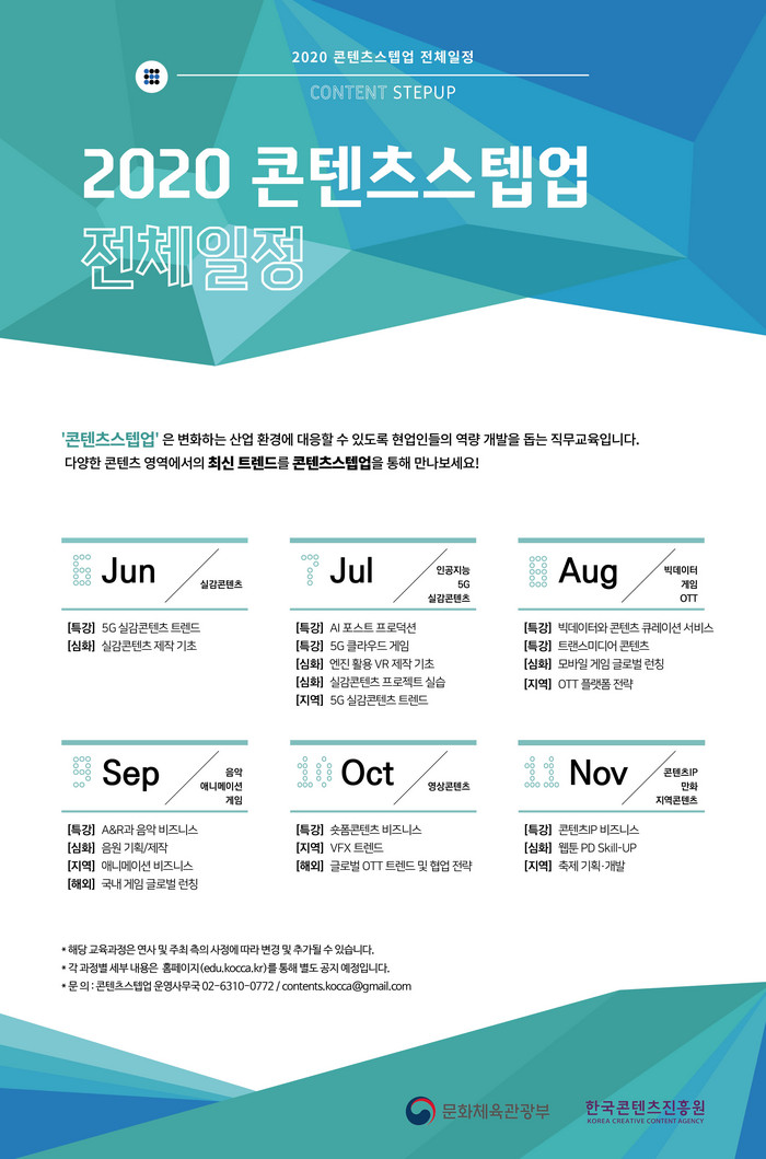 콘텐츠산업의 지속적인 성장과 업계 종사자들의 경쟁력 강화를 위해 진행하는 대표 직무교육 프로그램인 ‘콘텐츠 스텝업’은 올해 코로나19에 대비하기 위해 비대면 온라인 교육을 확대한다.