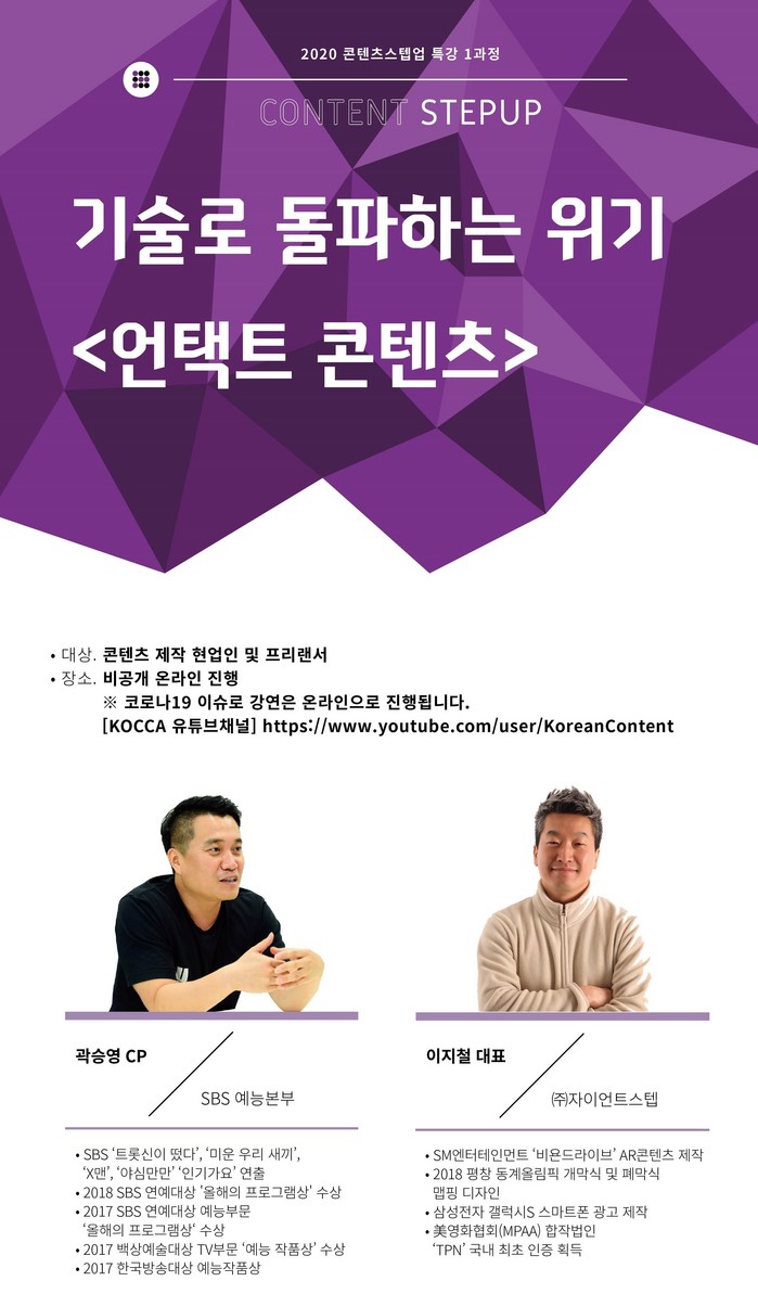 이번 기술로 돌파하는 위기 '언택트 콘텐츠' 특강은 포스트 코로나 시대 변화하는 콘텐츠산업 환경에 현업인들이 발 빠르게 대응할 수 있도록 마련됐다.