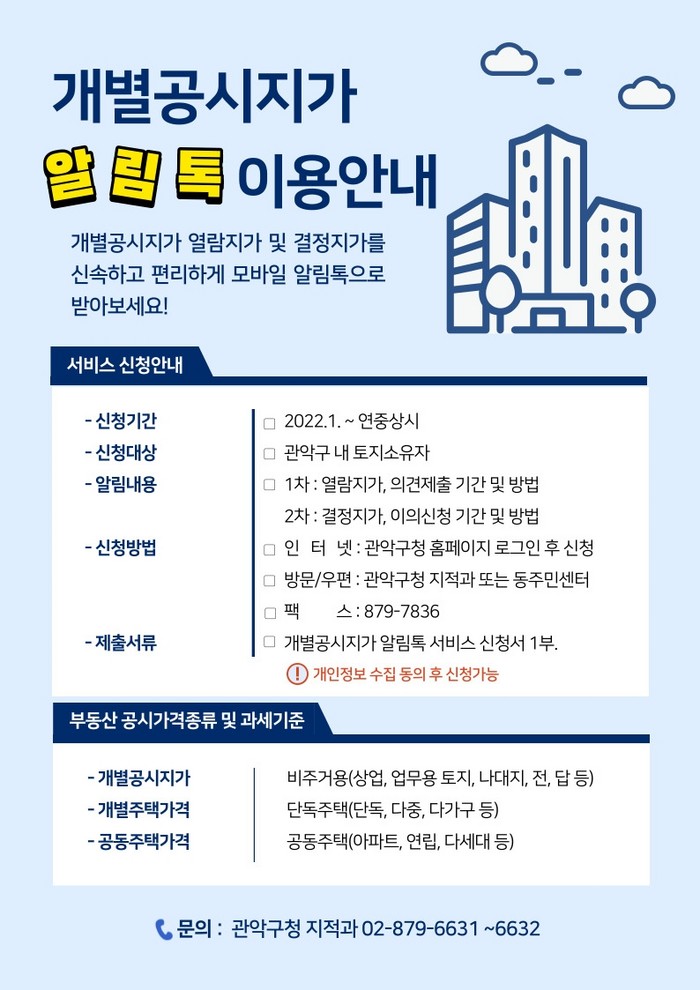 [로컬세계 임종환 기자]서울 관악구(박준희 구청장)가 올해부터 개별공시지가 정보를 신속하게 안내하는 ‘개별공시지가 알림톡 서비스’를 시행한다고 7일 밝혔다.