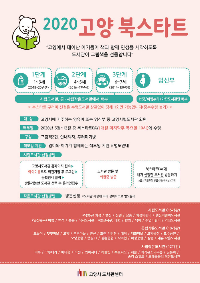 대상자는 고양시립도서관에서 회원증을 발급받고 홈페이지에서 신청 후, 매월 마지막 주 목요일에 신청한 도서관을 방문하면 책 꾸러미를 받을 수 있다. 미취학 아동은 고양시립도서관 또는 공·사립작은도서관 중에서, 임신부는 고양시립 화정·아람누리·가좌도서관 중에서 신청하면 수령 가능하다.