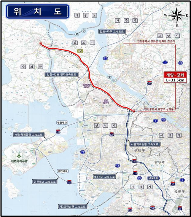 ‘계양~강화 고속도로 건설 사업’은 인천 계양구 상야동에서 김포를 거쳐 강화군을 연결하는 노선으로 연장 31.5㎞, 차로 수 4~6차로로 총 2조5786억원의 건설비용이 들어간다.