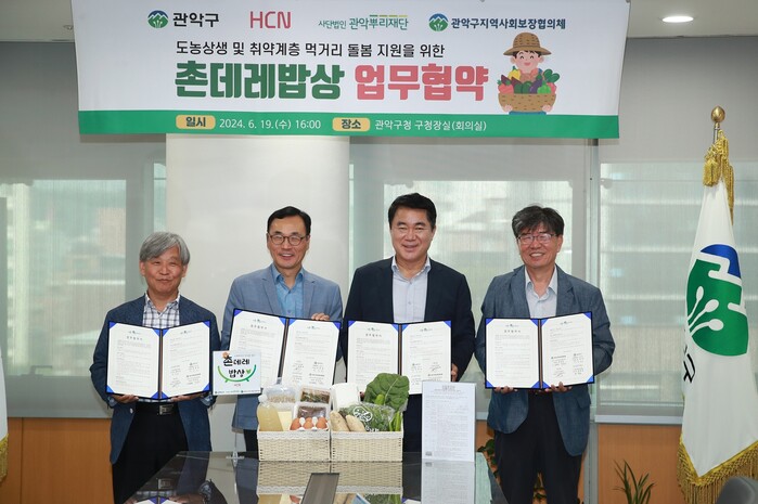 [로컬세계 = 임종환 기자]서울 관악구는 지난 19일 HCN, 사단법인 관악뿌리재단, 관악구 지역사회보장협의체와 도농 상생과 취약계층 먹거리 돌봄을 위한 ‘촌데레 밥상’ 업무협약(MOU)을 체결했다고 20일 밝혔다.